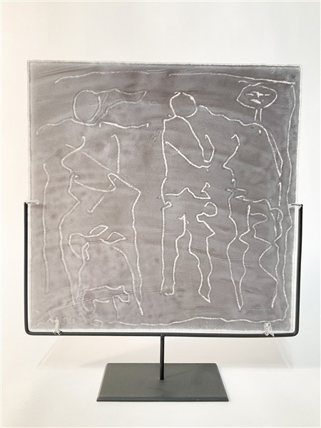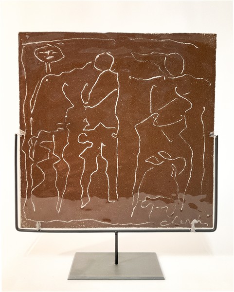 Lastra in vetro decorata a graffito su fondo marrone. Firmata in basso a destra. (cm 40,5x47)