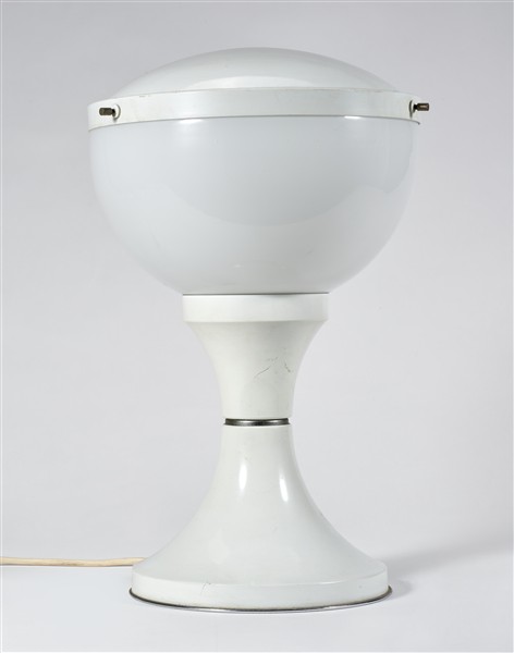 Lampada da tavolo. Produzione VALENTI & co, Milano, anni '60/'70. Lampada da tavolo in alluminio laccato bianco, metallo cromato e vetro incamiciato lattimo. (h cm 42) (lievi difetti)