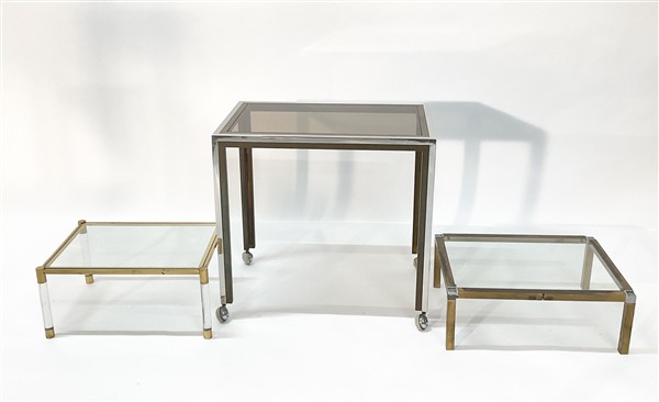 Lotto composto da tre diversi tavolini in metallo con piani in vetro, uno munito di rotelle. Italia, anni '70. (cm 70x67x45) (difetti)