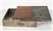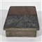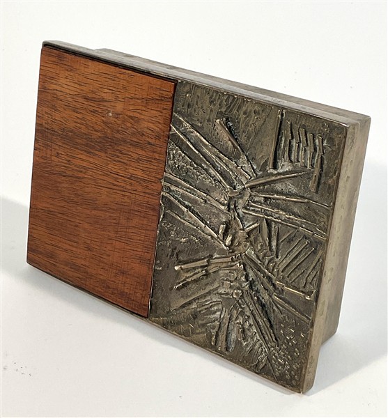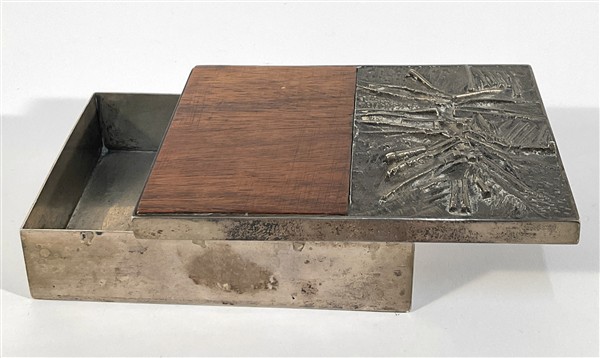 Scatola in argento 925, coperchio in argento e legno decorato con figurazione astratta a bassorilievo. (cm 14x4x10)