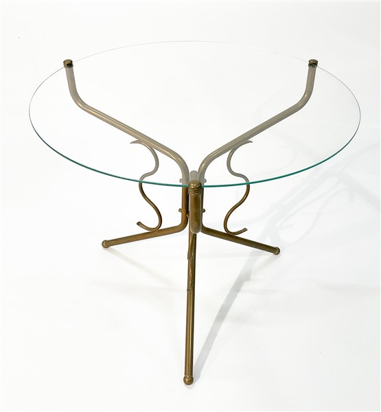 Tavolino in ottone con piano circolare in vetro non pertinente. Italia, anni '40/'50. (h cm 50; d cm 59,5)