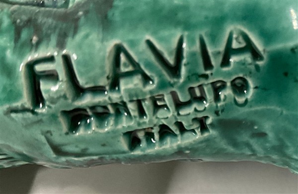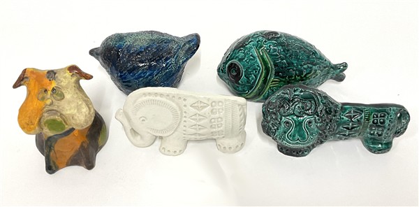 Due sculture della serie "Rimini Verde" e una della serie "Rimini bianca". Esecuzione Flavia, Montelupo fiorentino, anni '60. Ceramica formata a colaggio e smaltata sotto vetrina nei toni del verde e color bianco, e graffita con decorazioni geometriche. Recanti marchio della produzione. Unite a una scultura di uccellino di diversa manifattura smaltato blu e a un bulldog firmato sotto la base. (l max cm 18)