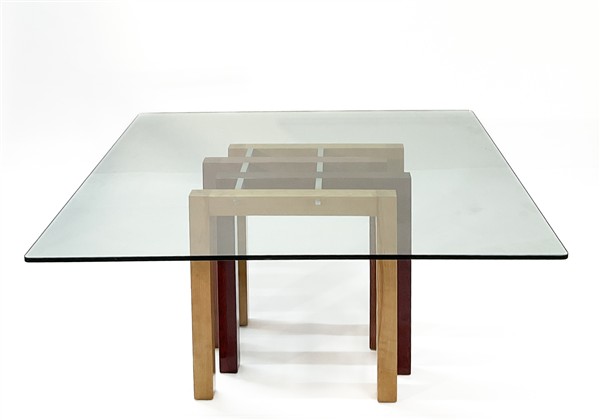 Tavolo della serie "Monos". Produzione Saporiti, Italia, anni '90/2000. Base in legno impiallacciato e laccato in diverse tonalità e alluminio anodizzato, piano in cristallo di forte spessore. (cm 145x70x145) (lievi difetti)