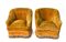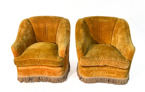 Coppia di poltrone imbottite con fusto in legno, gambe svasate e rivestimento in velluto color senape a frange. Italia, anni '30/'40. (cm 84x80x90) (lievi difetti)
