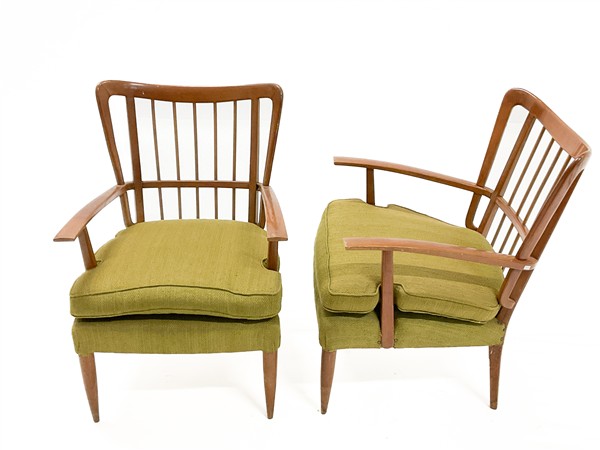 Coppia di poltroncine da camera in mogano massello, seduta rivestita in tessuto verde. Italia, anni '40. (cm 52x71x54) (gravi difetti e restauri)