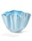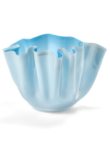 Vaso "fazzoletto" in vetro incamiciato lattimo e celeste e leggermente iridato sulla superficie esterna. Esecuzione Venini, Murano, anni '50/'60. Recante etichetta cartacea della manifattura sotto la base. (cm 23,5x15)