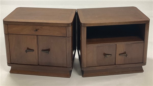 Coppia di comodini in legno massello impiallacciato di noce, maniglie in fusione di ottone. Torino, anni '40. (cm 67,5x59x37,5) (difetti)