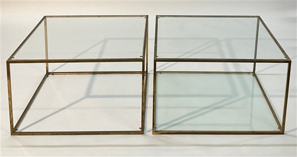 Coppia di tavolini da caffè in ottone con due ripiani in vetro (di cui uno manc