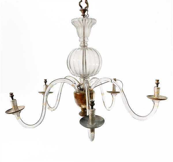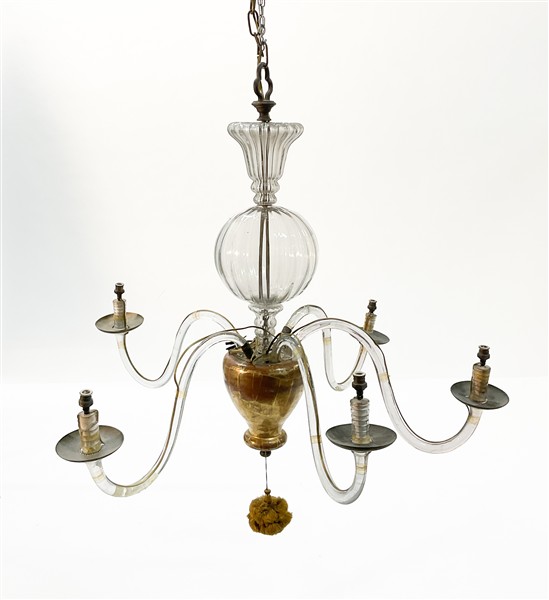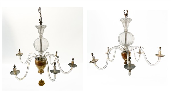 Due lampadari a cinque e sei bracci in vetro soffiato cristallo costolato e legno e gesso dorato. Inizio secolo XX. (cm max 105x95) (difetti)