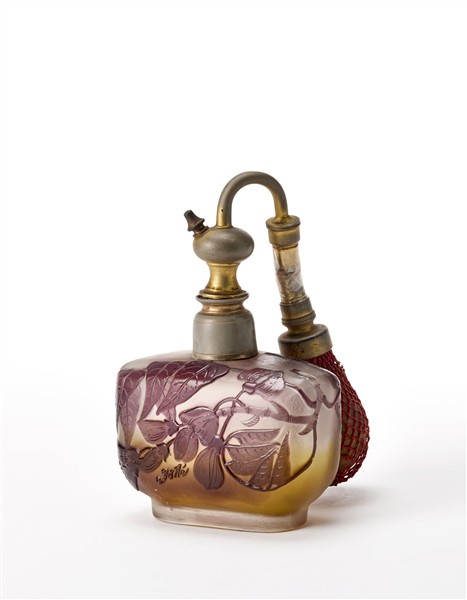 Gallé Spruzzatore di profumo in vetro a cammeo con decori viola. Nancy, inizio s