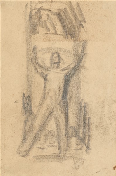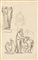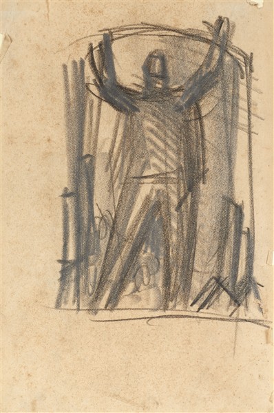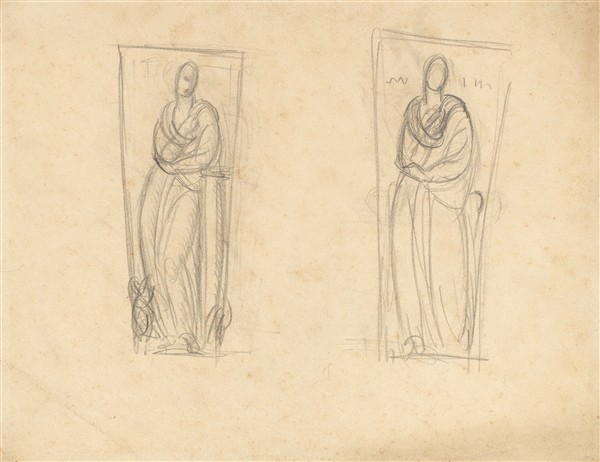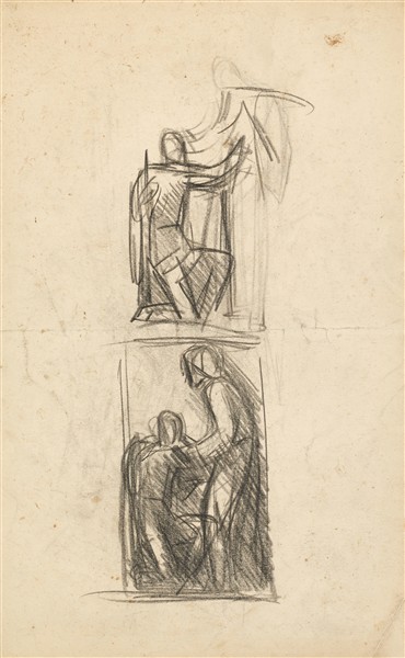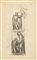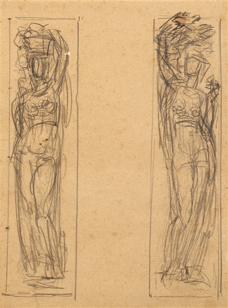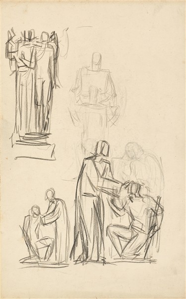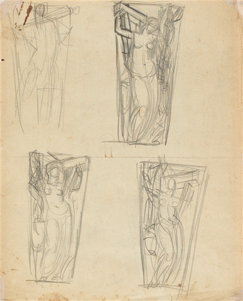 Lotto di sette fogli, di cui uno disegnato fronte-retro, raffiguranti disegni e schizzi preparatori per apparati decorativi scultorei. Milano, anni '30. Matita grassa su carta. Montati in cartoncino bianco passepartout (cm 46x60). (lievi difetti)