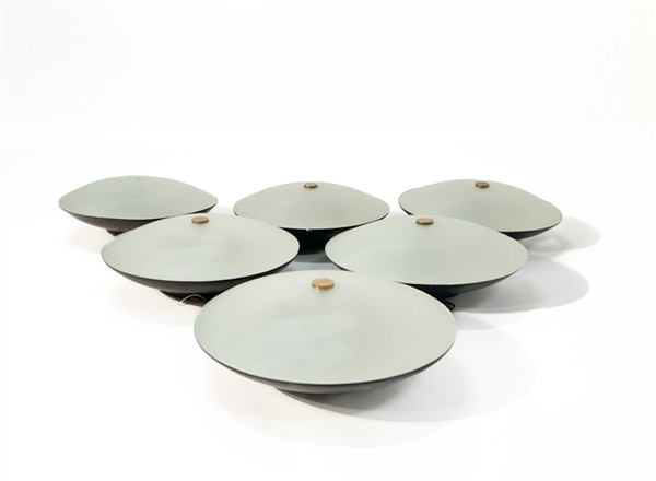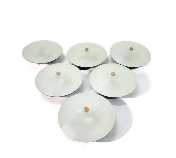 Sei lampade a plafone/parete. Italia, anni '60. Alluminio verniciato, ottone e vetro curvato. (d cm 40) (lievi difetti e mancanze)
