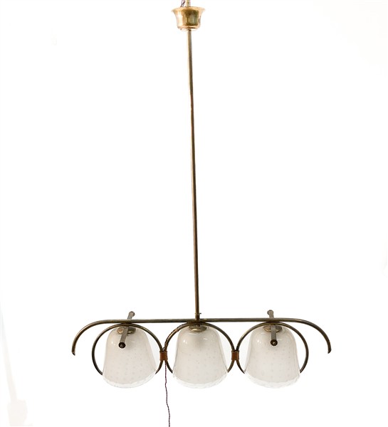 Lampada a sospensione a tre luci in ottone con diffusori in vetro parzialmente acidato sulla superficie interna con inclusione di bolle regolarmente disposte. Anni '40. (cm 84x115) (lievi difetti)