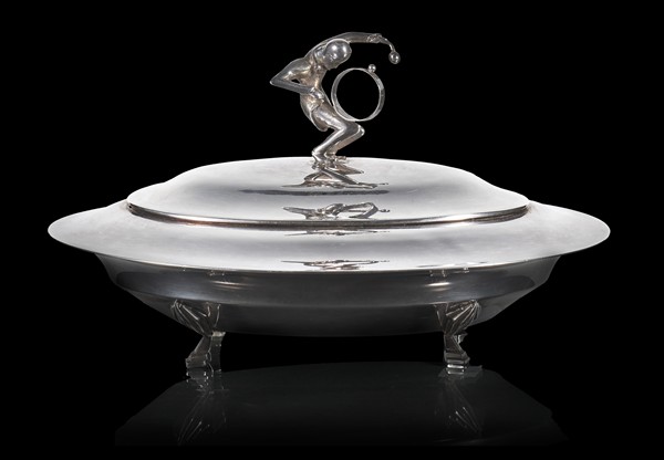 Scatola portagioie Art Déco in argento, titolo 800, con presa a foggia di suonatore di grancassa. Italia, 1925ca. (l cm 20,5, g 450) (mancanze)