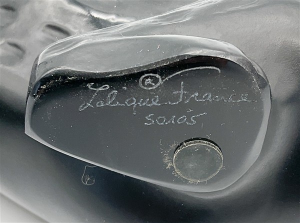 Scultura in vetro fumé pressato in forma. Firmata a punta sotto la base e numerato 50105. (l cm 33)