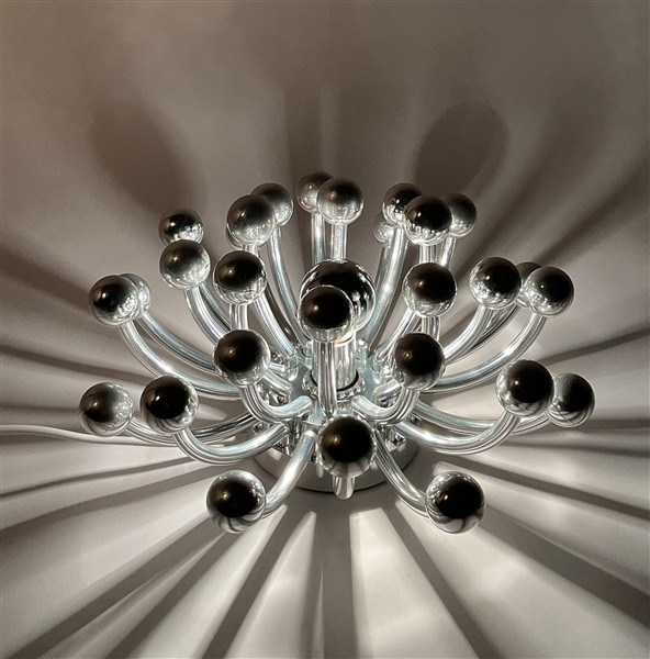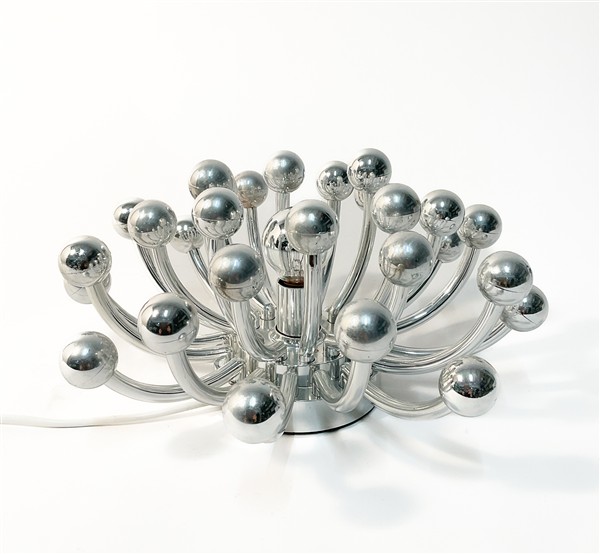 Lampada da tavolo con luce centrale modello "Pistillino". Produzione Valenti, Italia, 1969. Elementi stampati in abs argentato. Marcata sotto la base. In scatola originale. (d cm 30)