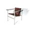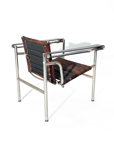 Poltrona ispirata al modello "LC1" di Le Corbusier, Pierre Janneret e Charlotte Perriand. Anni '60. Struttura in tubolare di acciaio, schienale e seduta rivestiti in cavallino, braccioli in cuoio. (cm 66,5x67x62)