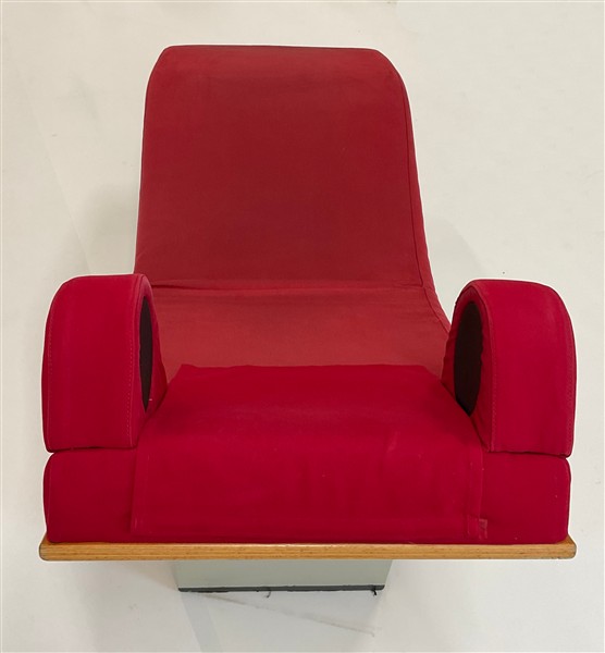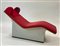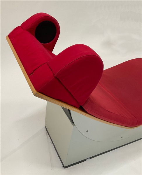 Chaise longue. Struttura in legno e legno tinto grigio, rivestimento in velluto e panno rosso. Sistema audio integrato Bluetooth. (cm 161x94x56) (lievi difetti e modifiche)
