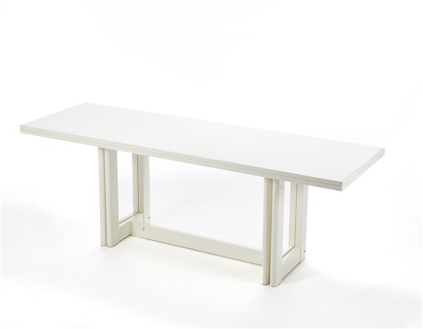 Tavolo con piano apribile a libro in legno massello laccato bianco con guarnizioni in ottone. Italia, anni '70. (piano chiuso cm 202x74x65) (lievi difetti)