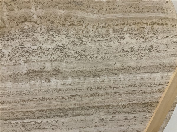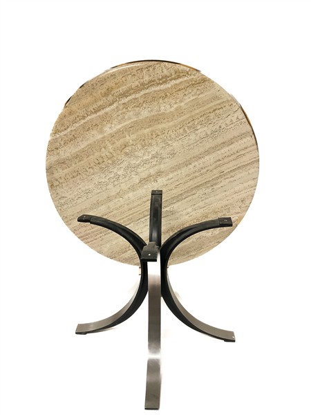 Tavolo modello "T69b". Produzione Tecno, Varedo, 1963. Piano in travertino, struttura in alluminio pressofuso con lamine spazzolate applicate. Recante marchio del produttore. (cm 147,5x70) (difetti e piccole mancanze)