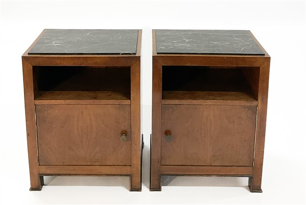 Coppia di comodini Novecento in legno di mogano impiallacciato e massello e piano in marmo nero venato. Italia, anni '30. (cm 50x66x38 l'uno) (difetti)