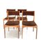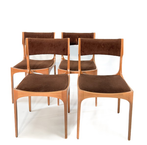 Quattro sedie modello "Elisabetta". Produzione Sormani, Arosio, 1962. Struttura in legno massello, seduta e schienale rivestiti in orsetto marrone. (difetti)