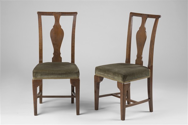 Coppia di sedie Novecento. Milano, 1925ca. Mogano massello e velluto grigio-verde. (difetti e mancanze)