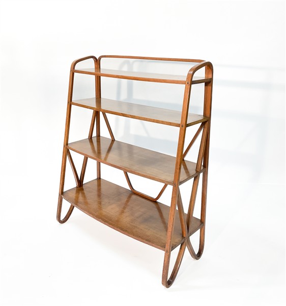 Étagère a quattro ripiani in legno di faggio curvato al vapore. Vienna, prima metà secolo XX. Lacerto di etichetta sotto la base. (cm 100,5x123x40,5) (difetti)