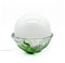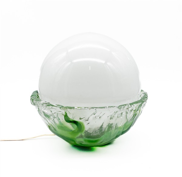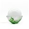 Lampada da tavolo in vetro soffiato di forte spessore cristallo a colature verdi e diffusore in vetro incamiciato lattimo. Murano, anni '70. (d cm 25,5) (difetti)