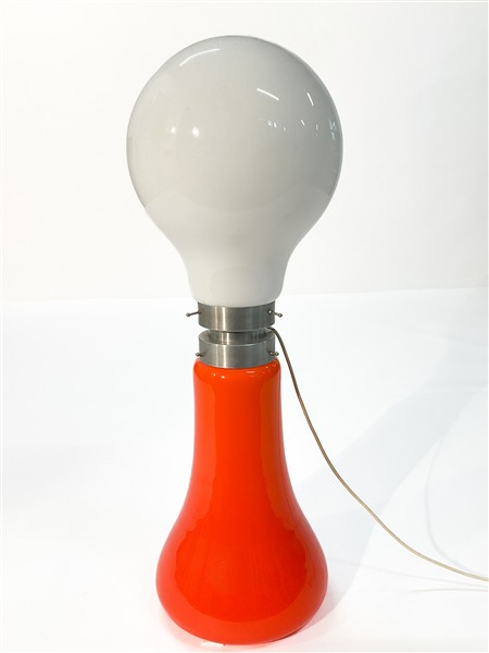 Lampada da terra/tavolo. Produzione Mazzega, Italia, anni '70. Vetro opalino e arancio, e metallo. (h cm 97)
