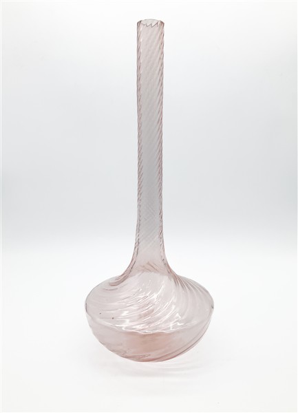 Grande vaso soliflore con corpo a bulbo e costolature ritorte in vetro soffiato rosa trasparente. Seconda metà secolo XX. Firmato a punta "Seguso A" sotto la base. (h cm 47)