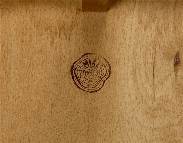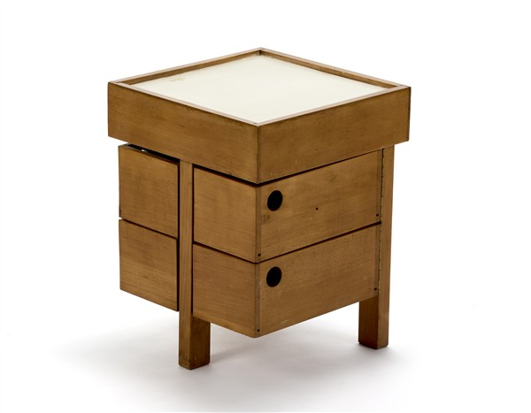 Tavolino contenitore in legno massello con quattro cassettini apribili a libro e piano verniciato bianco. Marcato a fuoco "MIAL". (cm 33x43x33) (lievi difetti)