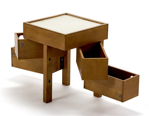 Tavolino contenitore in legno massello con quattro cassettini apribili a libro