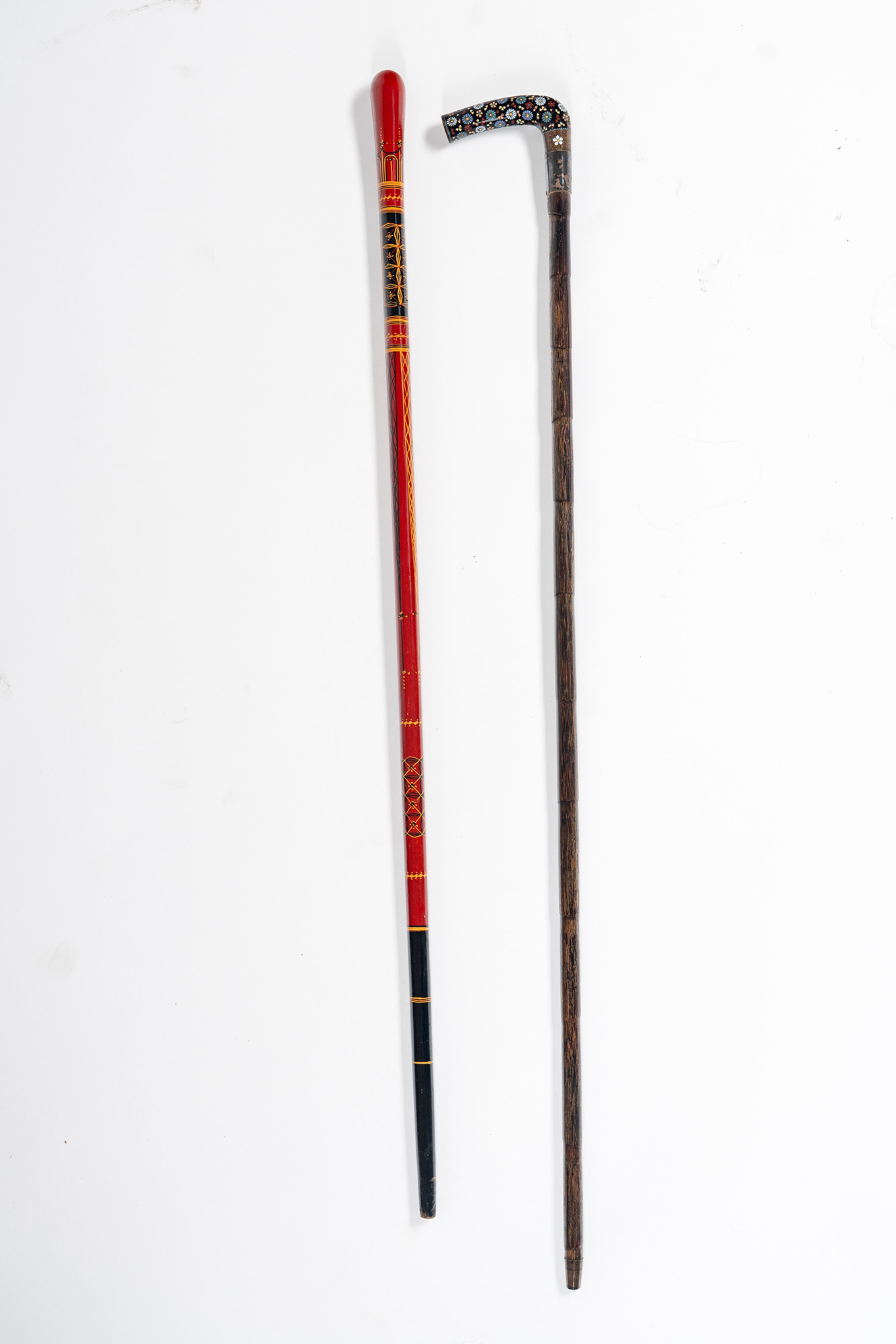Uno francese, in legno con presa cloisonnè in smalto su rame a motivi di fiorellini policromi. L'altro russo in legno laccato su fondo bordeaux con fasce nere decorate in oro, impugnatura a pomolo.