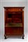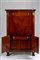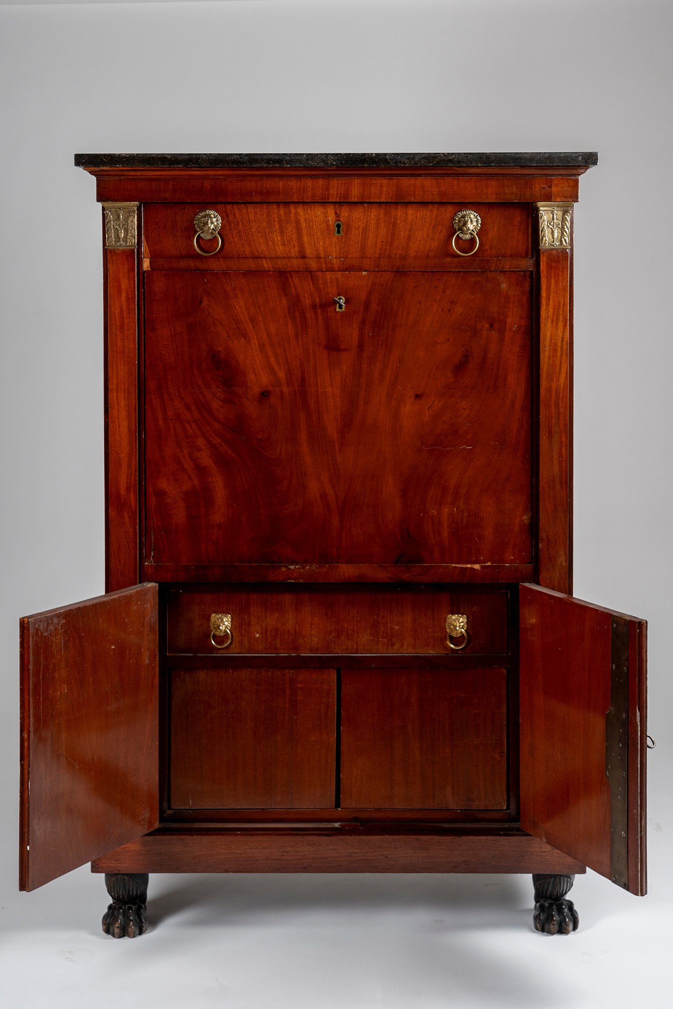 Fronte a due sportelli, anta ribaltabile ed un cassetto. Gli sportelli celanti due ante ed un cassetto interno; l'anta ribaltabile con piano rivestito in cuoio verde impresso in oro e celante scarabattolo architettonico a due cassetti, cinque tiretti ed un vano. Montanti a lesene sormontate da fregi dorati a capitelli, prese a teste leonine con anello, piedi anteriori intagliati a zampa ferina. Difetti e restauri. Fronte a due sportelli, anta ribaltabile ed un cassetto. Gli sportelli celanti due ante ed un cassetto interno; l'anta ribaltabile con piano rivestito in cuoio verde impresso in oro e celante scarabattolo architettonico a due cassetti, cinque tiretti ed un vano. Montanti a lesene sormontate da fregi dorati a capitelli, prese a teste leonine con anello, piedi anteriori intagliati a zampa ferina. Difetti e restauri.