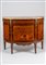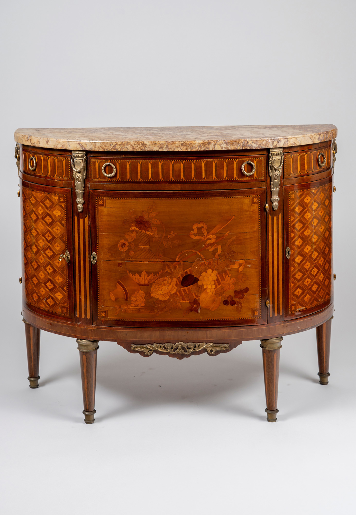 Difetti e restauri.Anta centrale decorata con motivi floreali, vegetali ed un'anfora; le laterali ricurve e intarsiate a motivo geometrico di losanghe con fiorellino, montanti e piedi troncoconici decorati a finta scanalatura. Tre cassetti nella fascia superiore ornati da fregi in bronzo dorato e cesellato. Piano in marmo Brèche d'Alep.