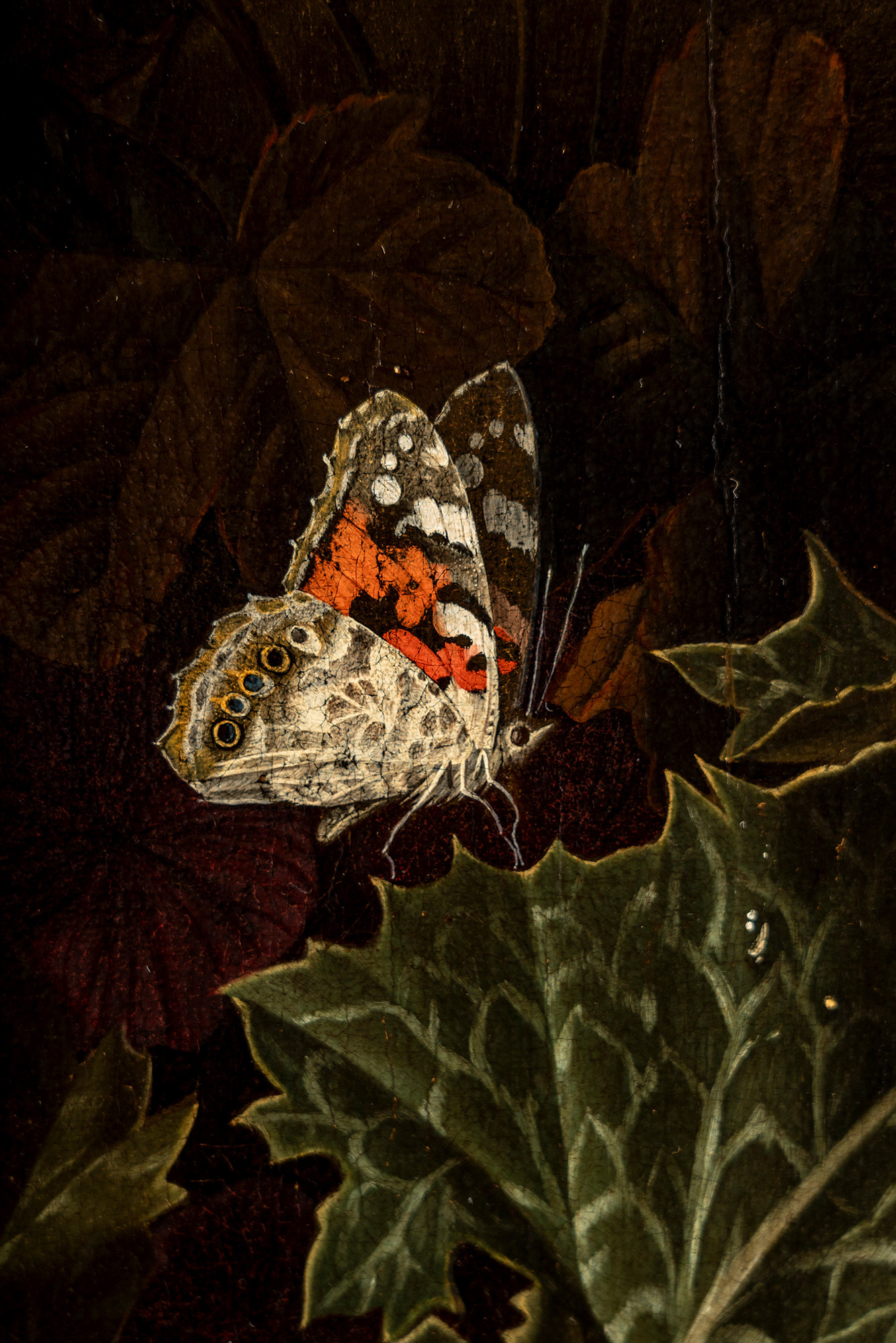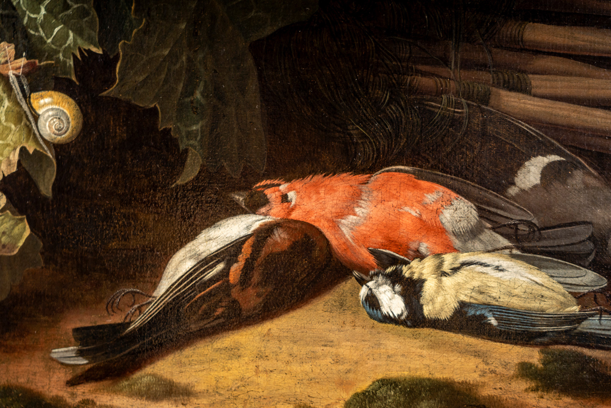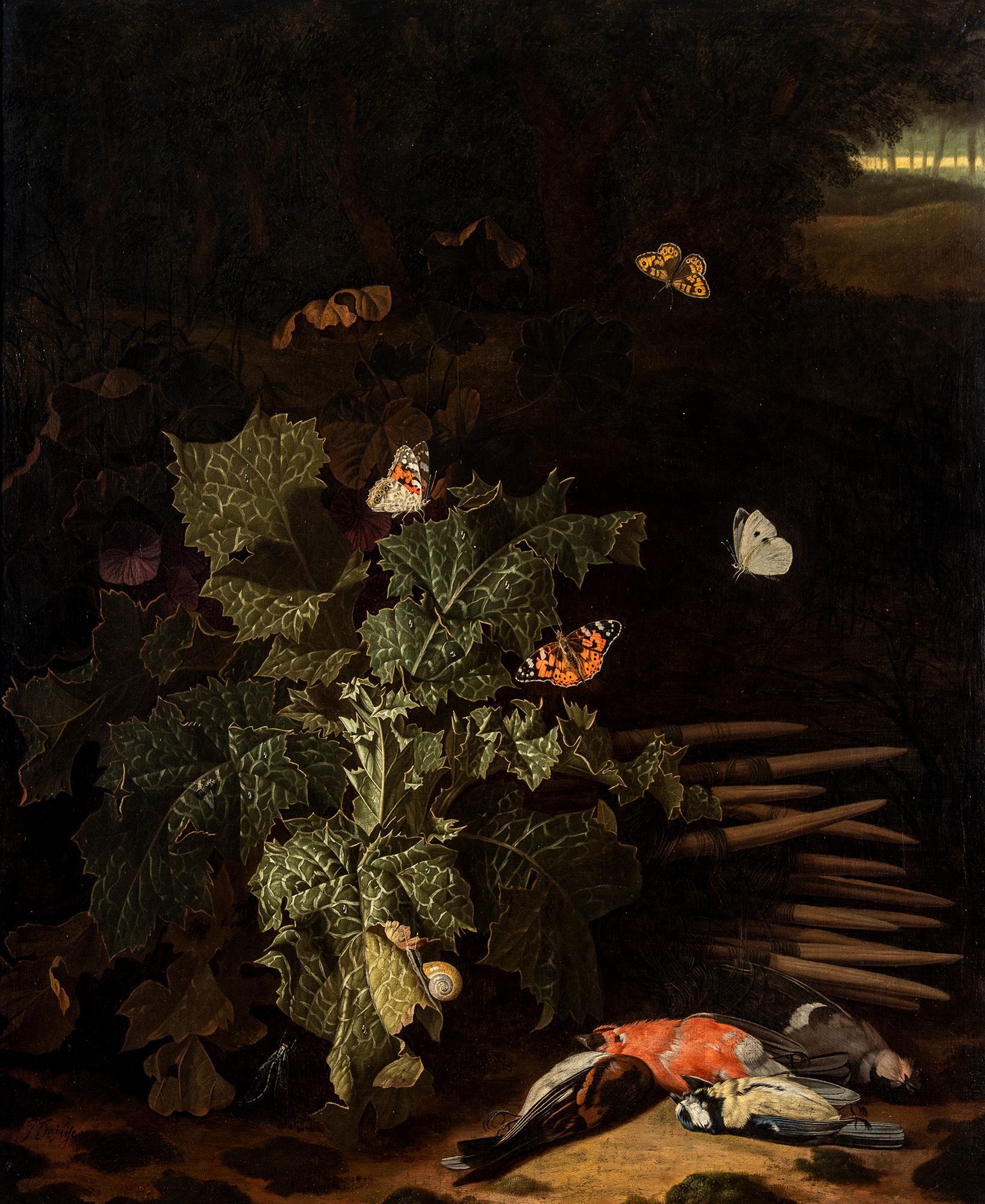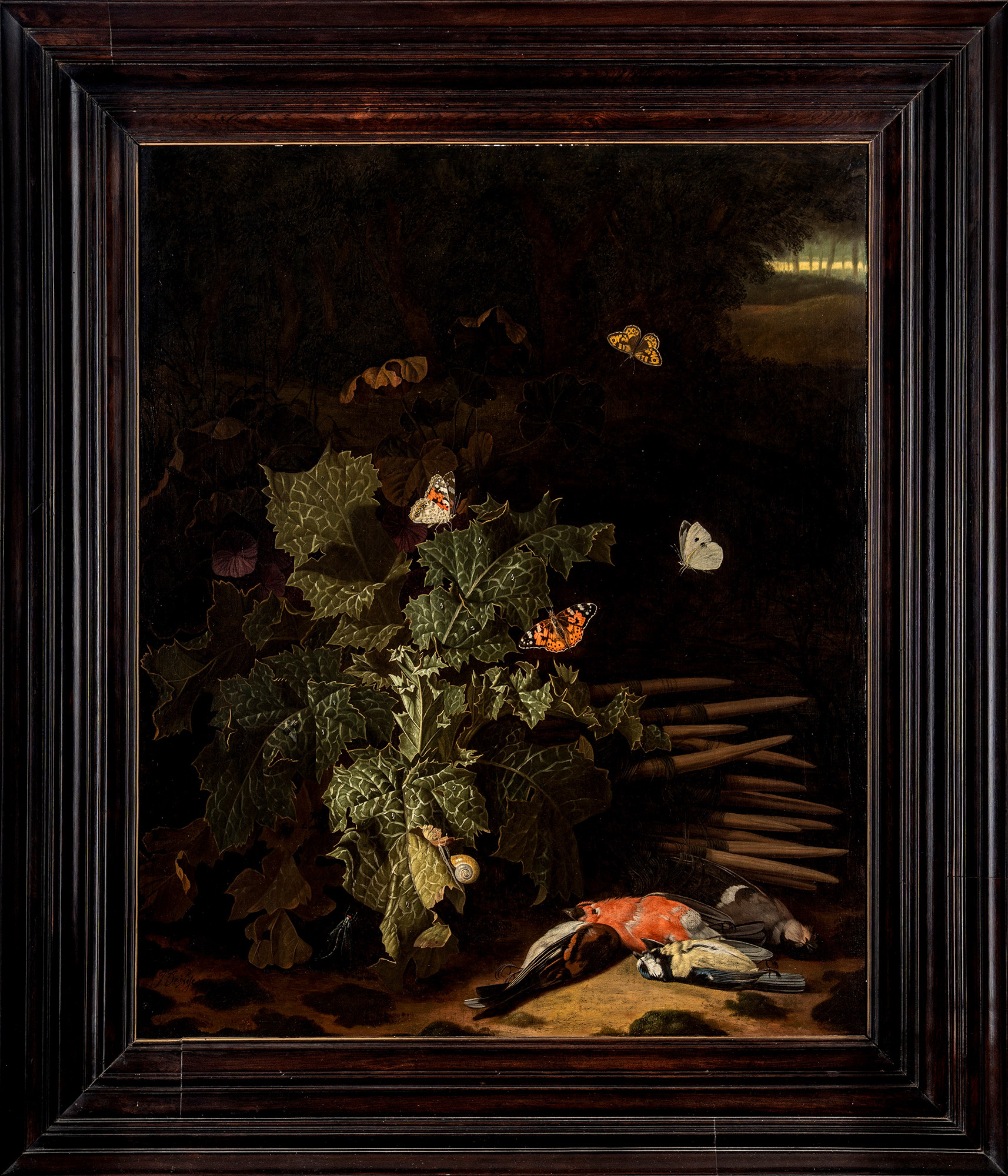 Isaac Denies (1647 - 1690) - Natura morta con farfalle e cardellini en plein air