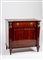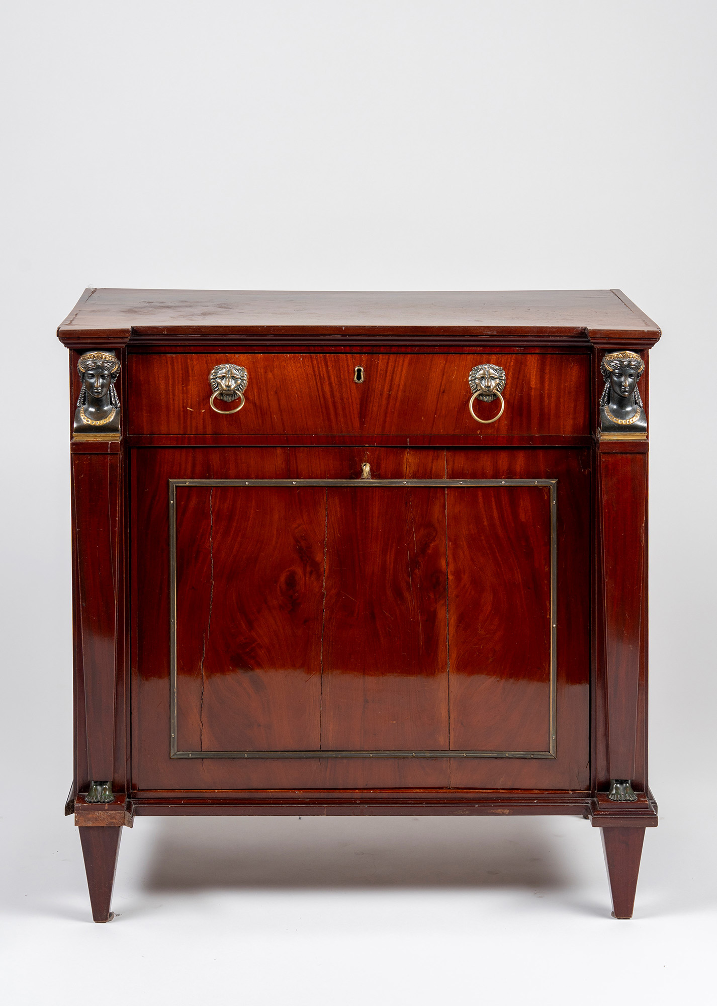 Montanti a obelisco rovesciato sormontati da busti e terminanti a piedi femminili in bronzo brunito. Il cassetto con maniglie in bronzo a teste leonine. Piedi troncopiramidali. Difetti e mancanze. Montanti a obelisco rovesciato sormontati da busti e terminanti a piedi femminili in bronzo brunito. Il cassetto con maniglie in bronzo a teste leonine. Piedi troncopiramidali. Difetti e mancanze.