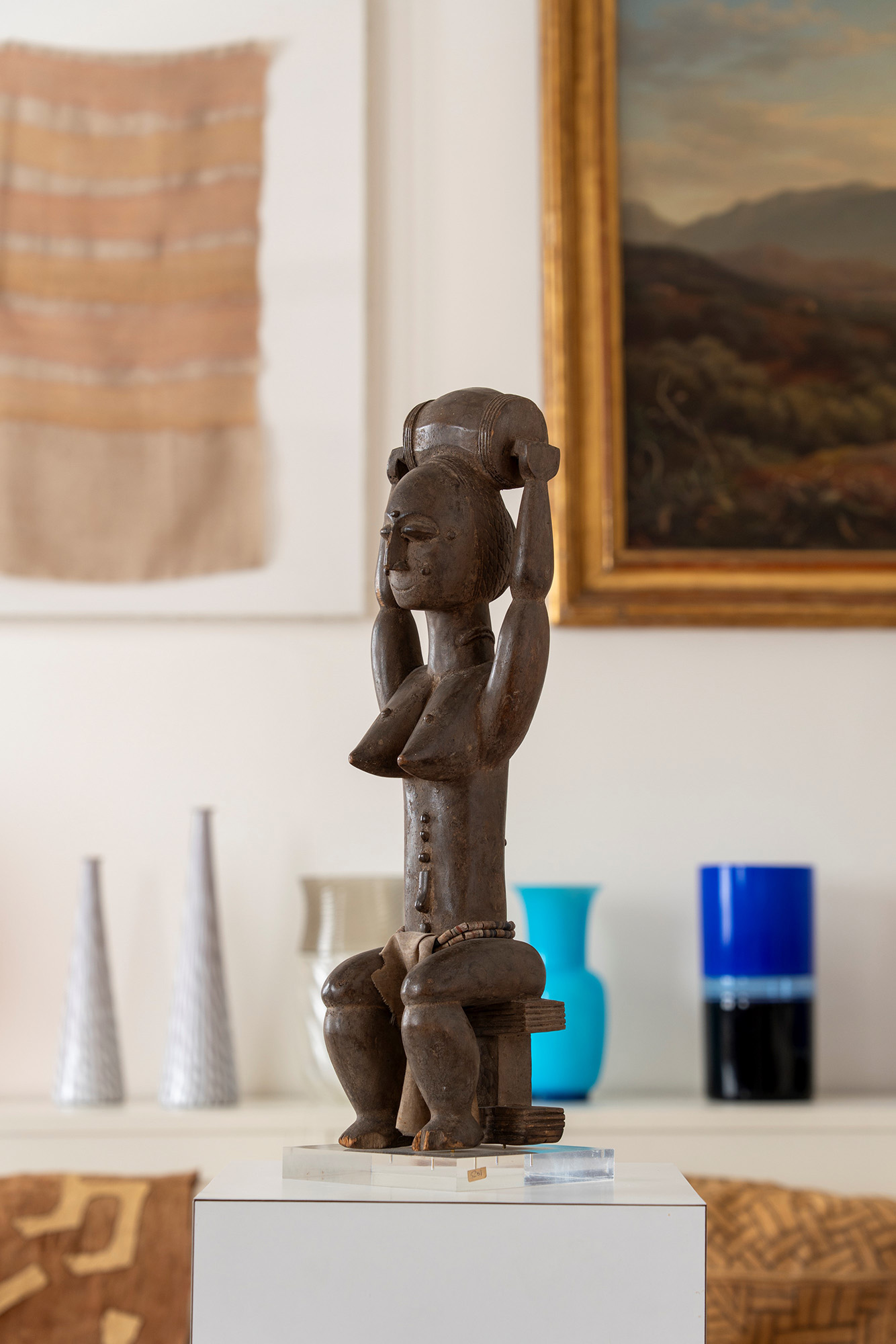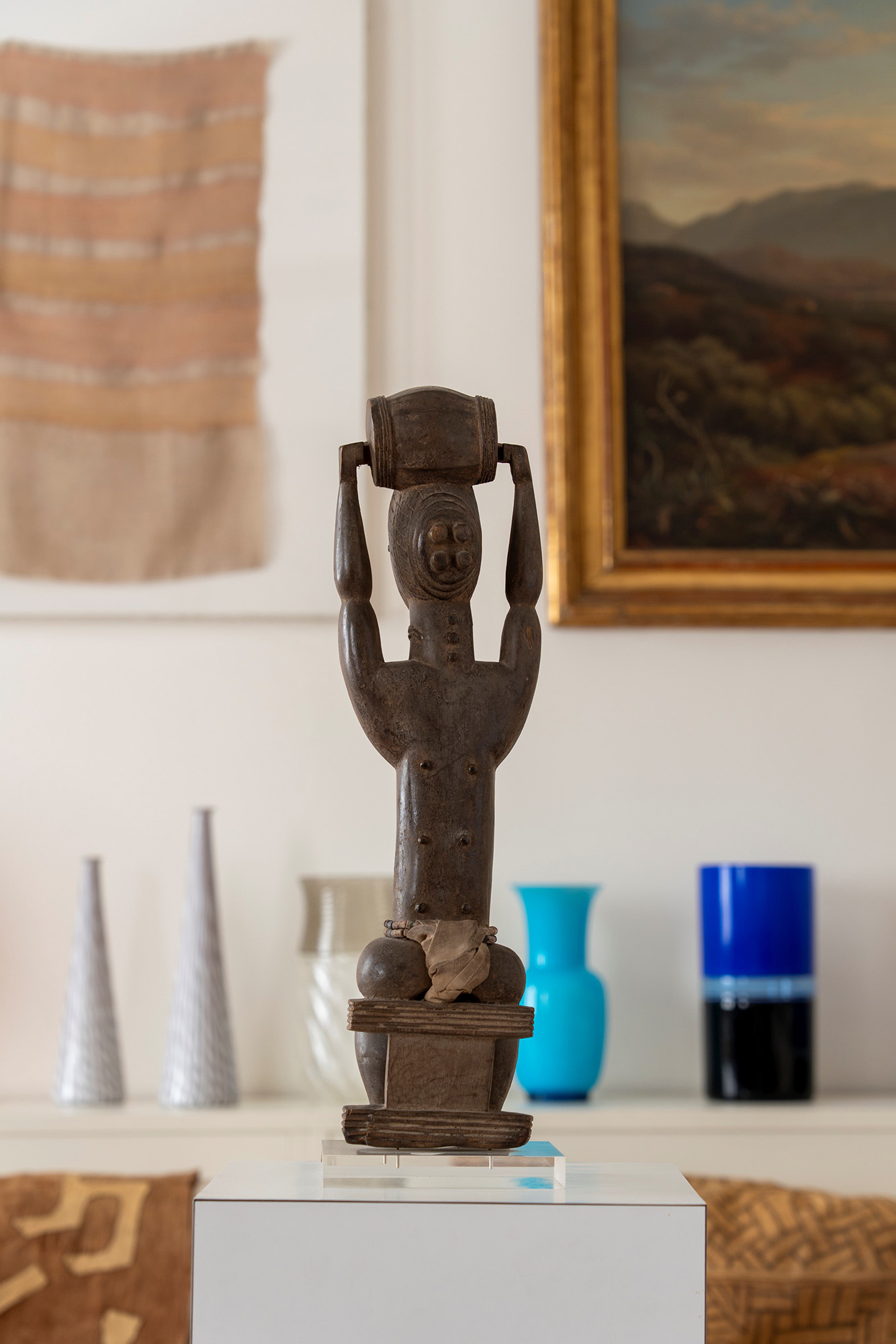 La scultura raffigura una figura femminile che sostiene un contenitore sulla testa e indossa un perizoma di tela sostenuto con un giro di perline di vetro.