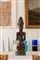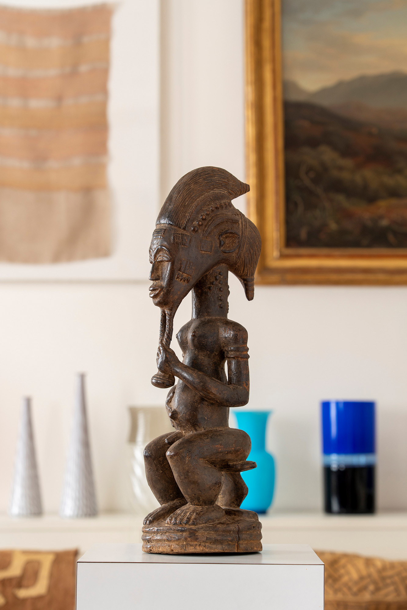 La complessa composizione di quest’opera nella quale sono evidenziati la pettinatura, le braccia asimmetriche, le scarificazioni del corpo seduto sul seggiolino, testimoniano l’abilità dello scultore. La forte erosione del legno, presente sotto la base, è un indice di acclarata anzianitàin legno con densa patina scura, segni d'uso.