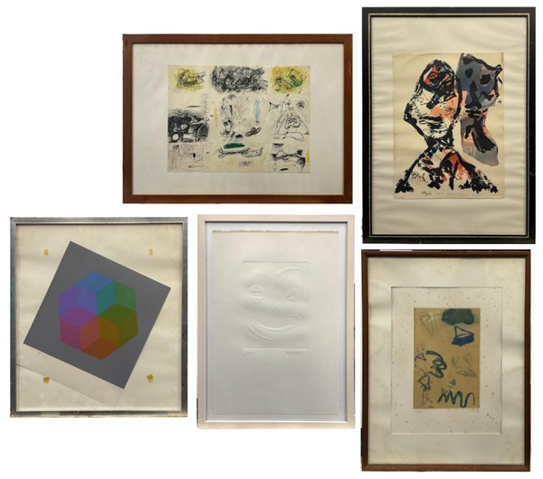 Lotto composto da tre grafiche astratte di autori, soggetti e misure diverse (misura max cm 50x35) rispettivamente di Carlo Rosa, Voss e Wurmfeld e due riproduzioni di Gorky e Appel dalla cartella "Edizioni d'Arte. 40 disegni di Maestri Moderni" 1963 (cm 35x46)