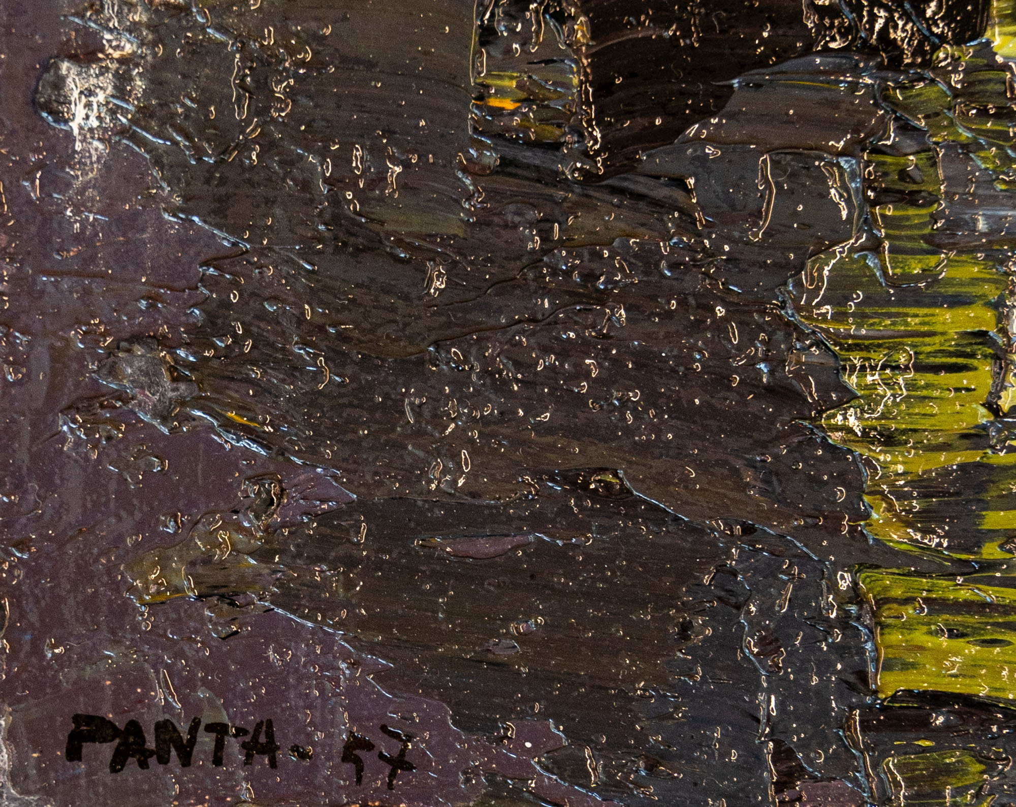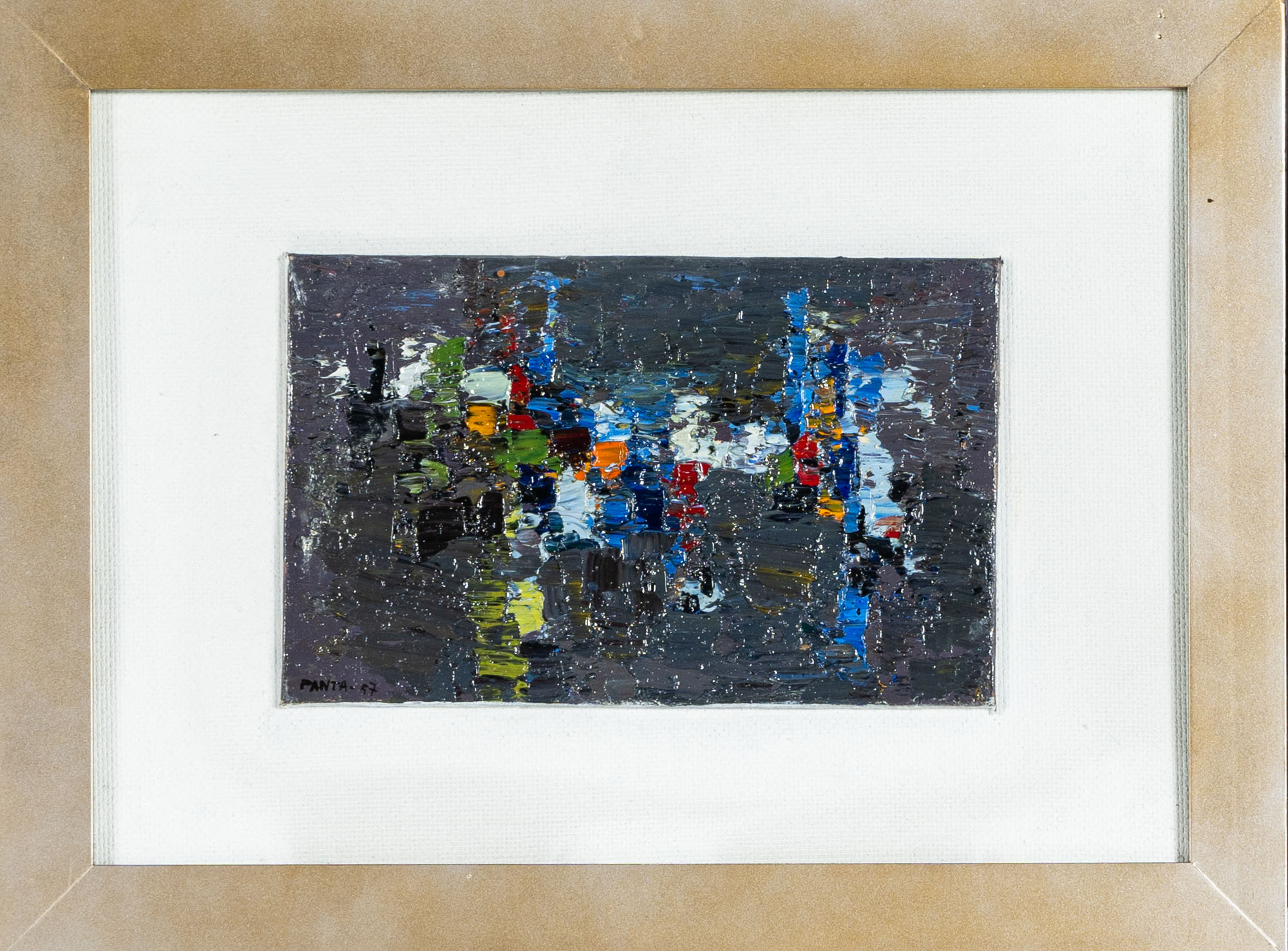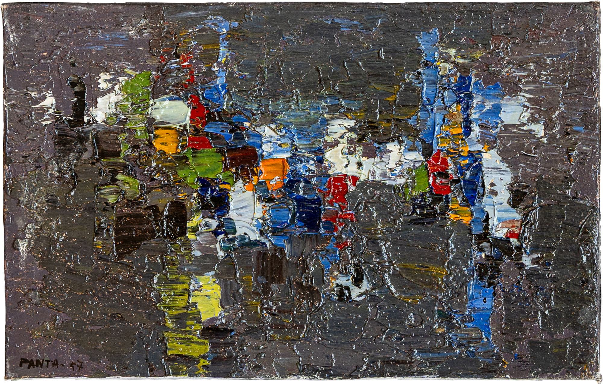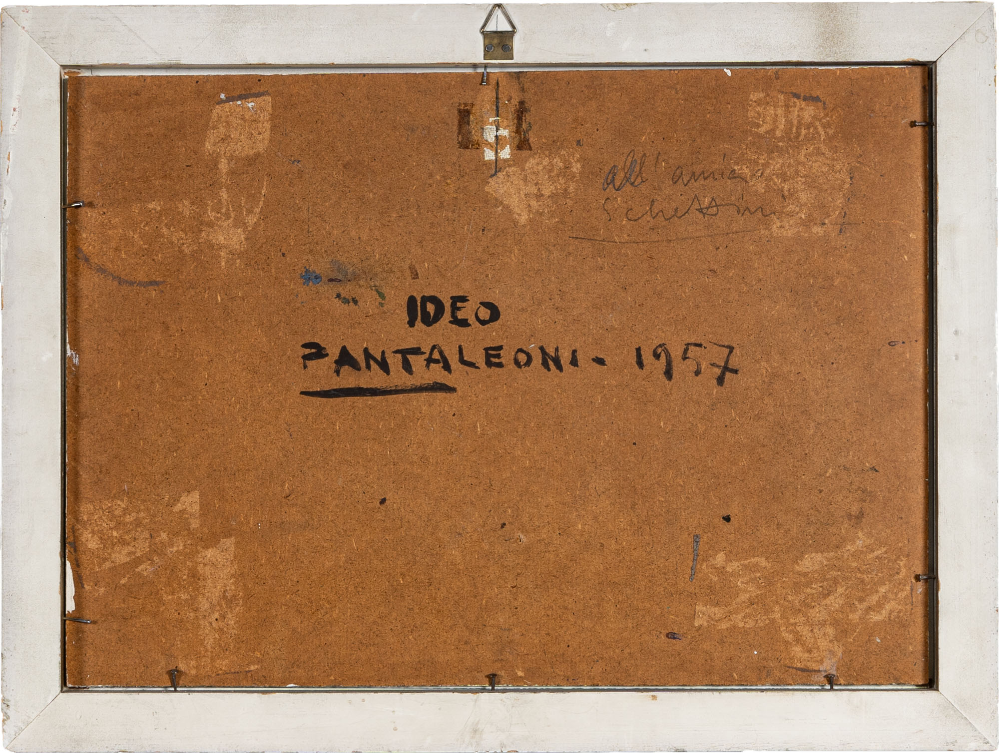 IDEO PANTALEONI(1904 - 1993)Senza titolo1957Olio su tela applicata su pannello14 x 22 cmFirmato e datato in basso a sinistraFirma al retroPROVENIENZA:Collezione privata, Milano