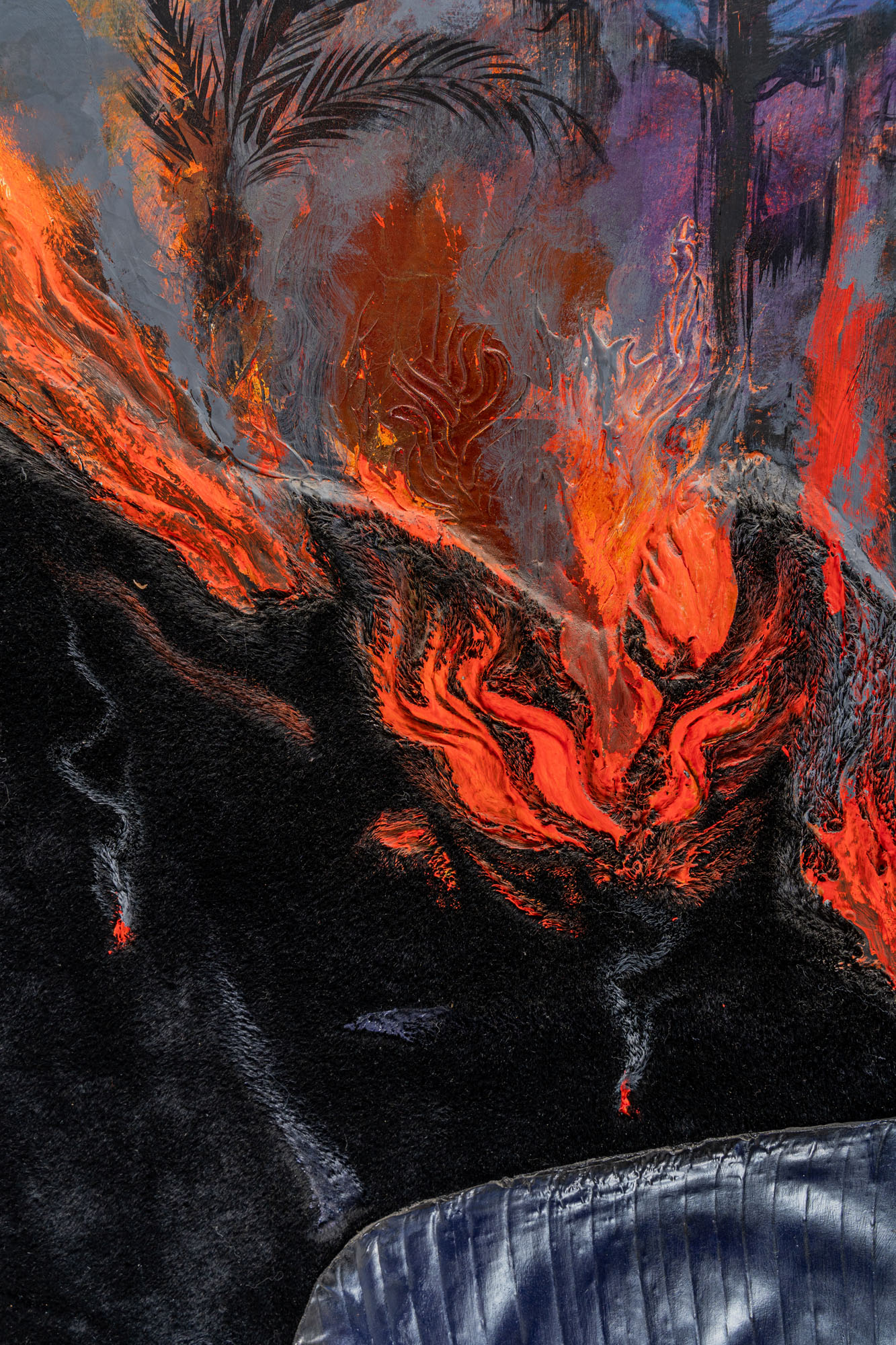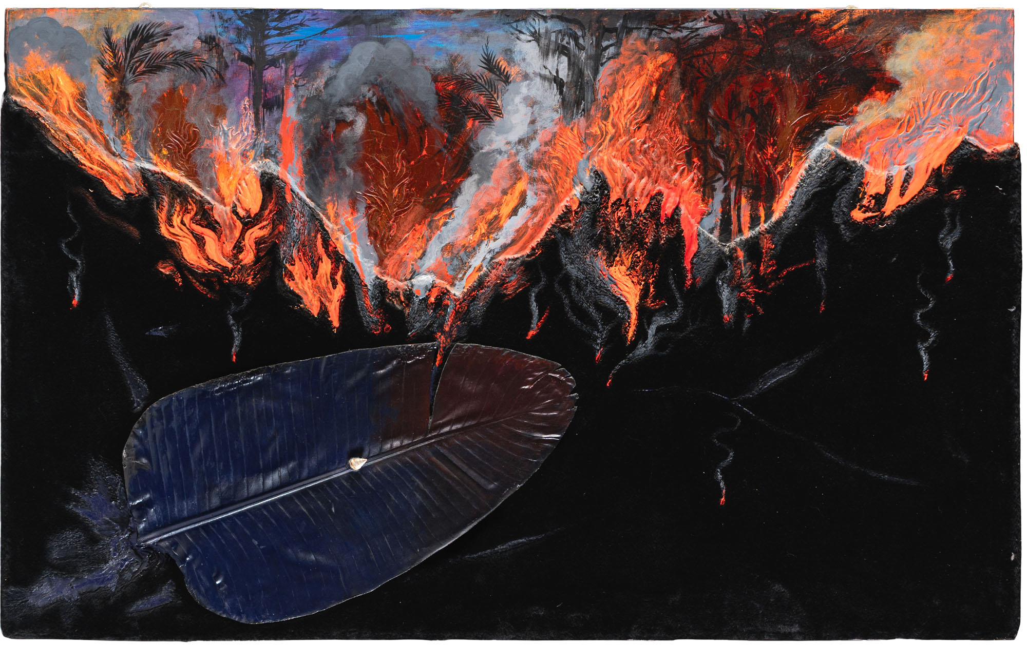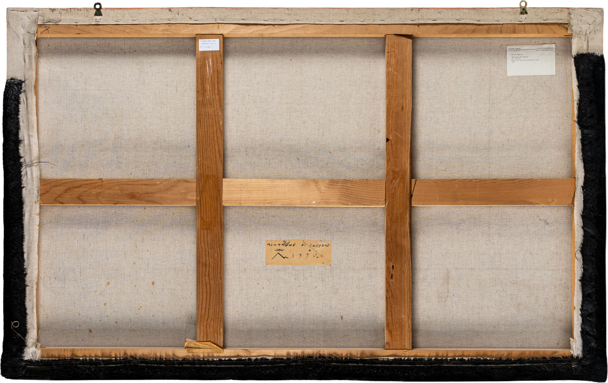 SILVIO MERLINO(1952)Montagne di carezze1990Olio e applicazioni su tela96 x 155 cmTitolo e data su etichetta al retroPROVENIENZA:Galerie Aline Vidal, Parigi (etichetta al retro)Collezione privata, Milano