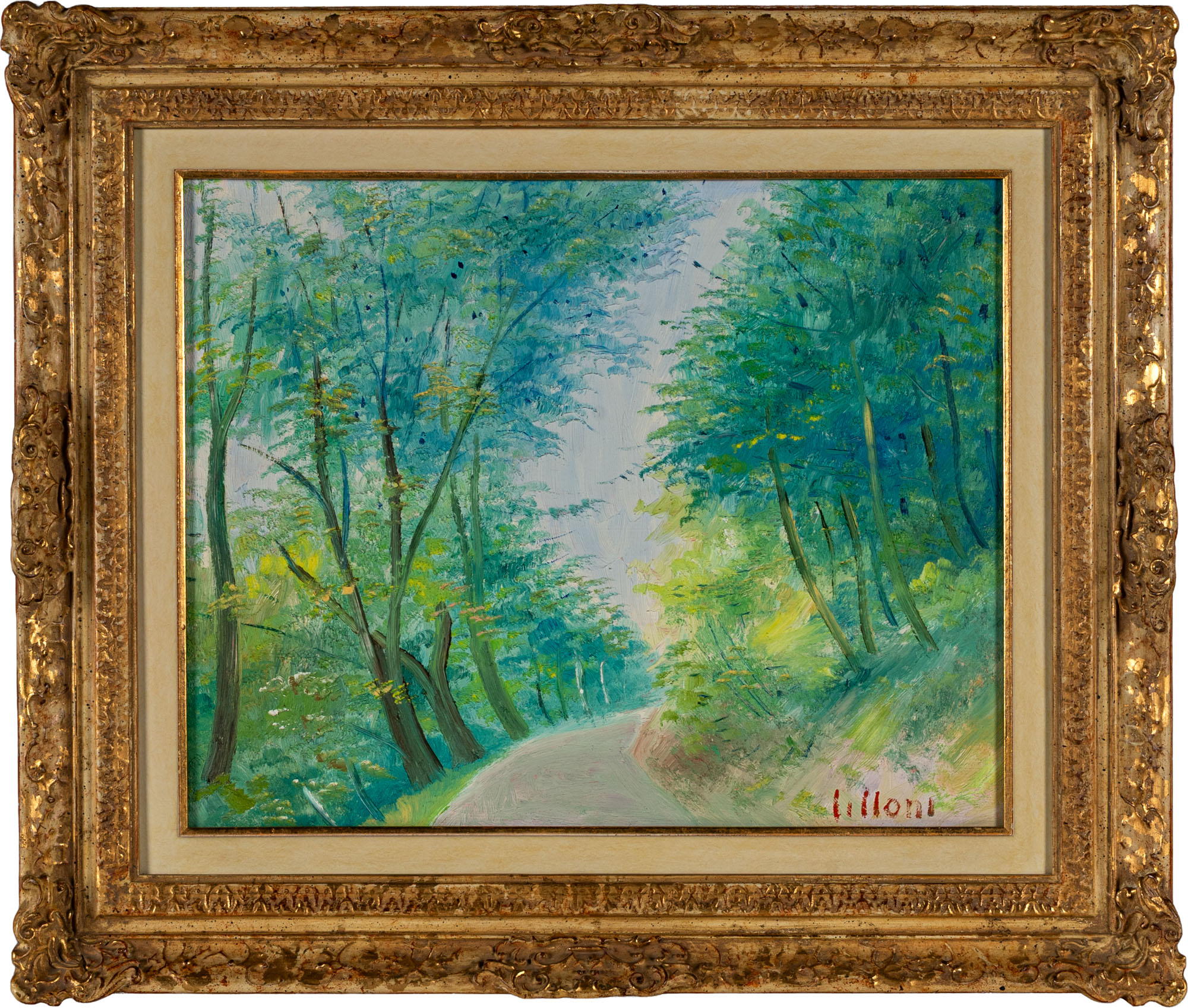 UMBERTO LILLONI(1898 - 1980)Strada a Lugano1966Olio su tela40 x 50 cmFirmato in basso a destraFirma, data, titolo e dichiarazione di autenticità al retroPROVENIENZA:Collezione privata, Milano