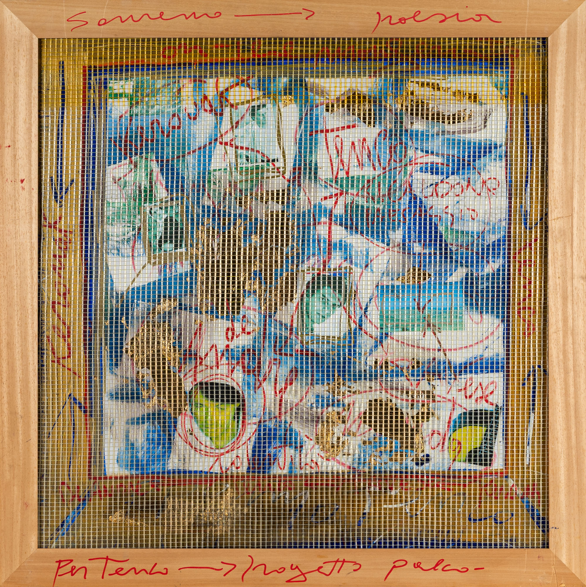 Tecnica mista e applicazioni su cartone entro cornice d'artista
