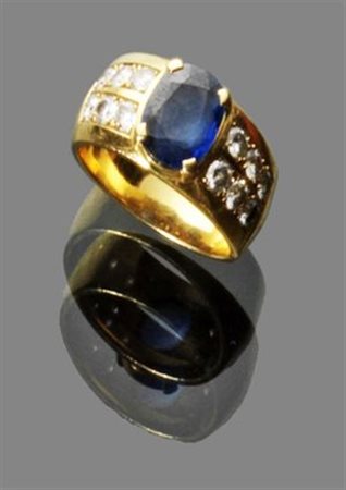 ANELLO Anello a fascia in oro giallo con zaffiro di taglio ovale ct 2,20 ca e diamanti taglio brillante per complessivi ct 1,00 ca Peso gr 10,20 Band ring in yellow gold with 2.20 ct oval cut sapphire and brilliant cut diamonds approx totaling about 1.00 ct Weight 10.20 gr