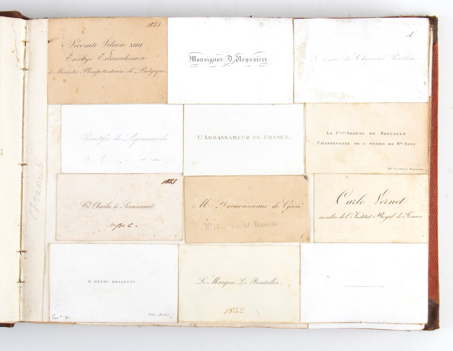 Collezione di 4 volumi in 4 ° oblungo contenente una collezione di più di 1500 biglietti da visita italiani e stranieri incollati su carta e distribuiti in 4 volumi in 4° grande con legatura coeva in mz pelle. Figurano i nomi di Horace Vernet, Carl Vernet, il cavalier Valadier, i principi Torlonia, Orsini, Aldobrandini, Albani, Altieri.