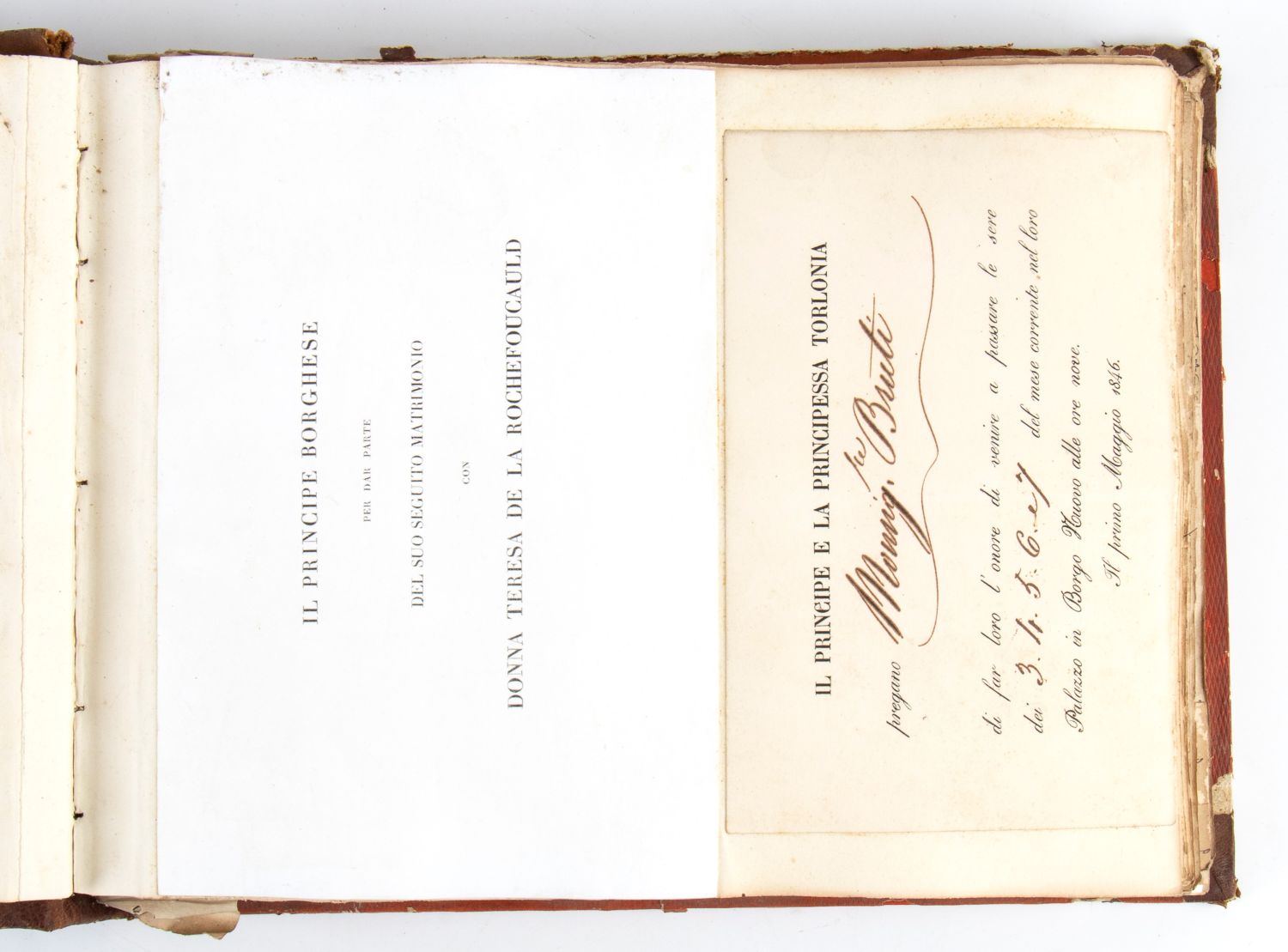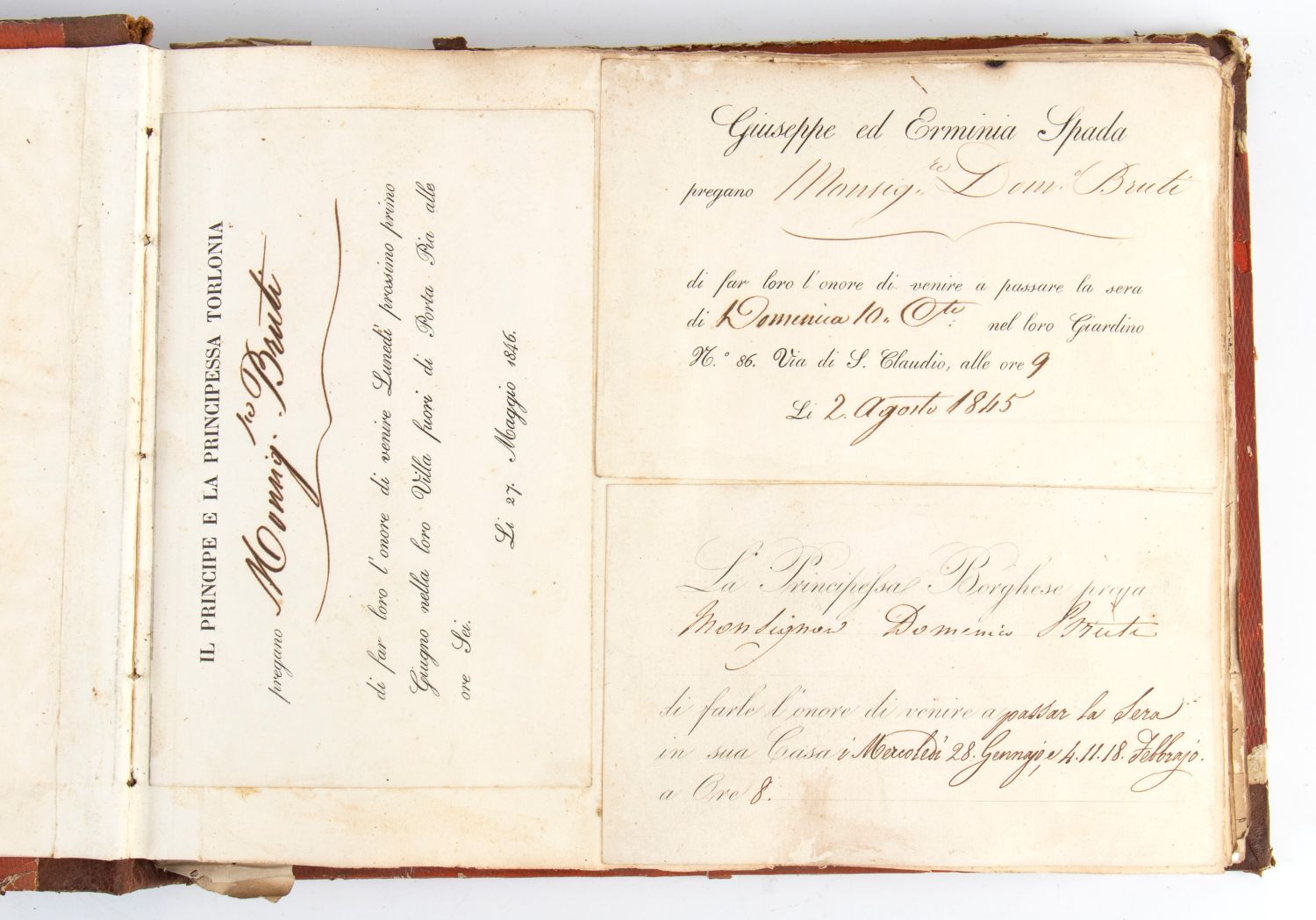 Volume in 4° oblungo con una raccolta di più di 160 biglietti da visita di famiglie romane incollati su 55 fogli dal 1830 al 1870 circa. Ogni foglio contiene dai due ai quattro biglietti, in qualche caso manoscritti. Figurano i principi Torlonia, La famiglia Altieri Doria Pamphili, Colonna, Boncompagni Ludovisi.