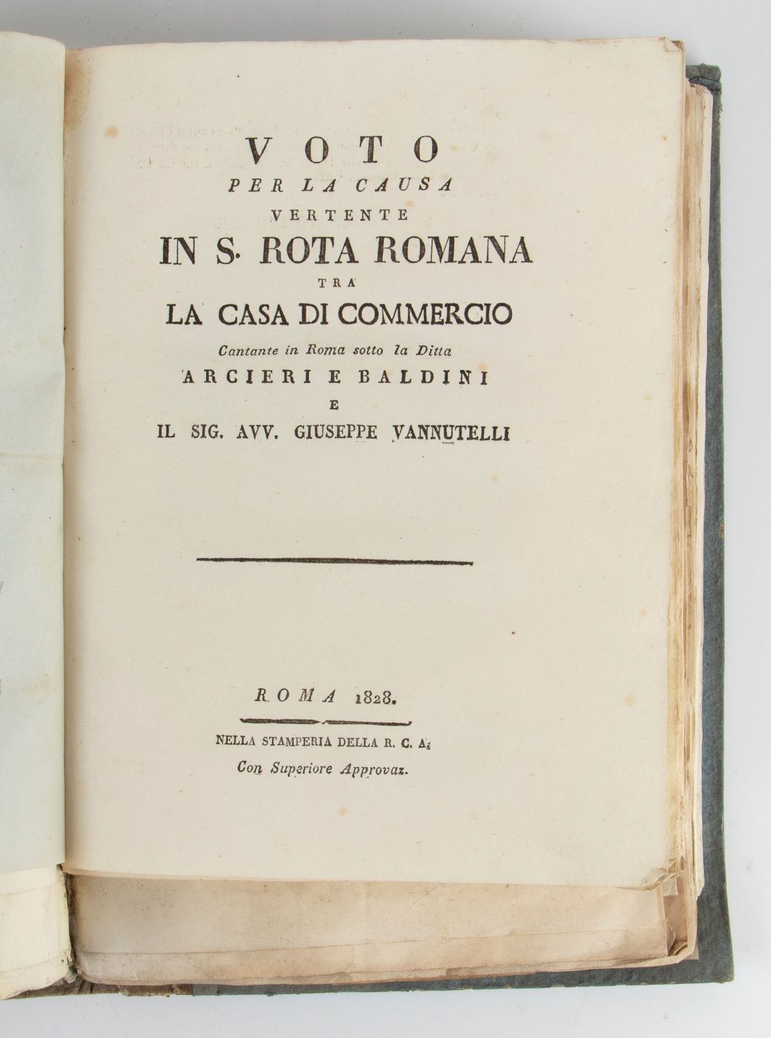 Volume in folio piccolo composto da più di sessanta dissertazioni a stampa e manoscritte, databili tra la metà del XVIII e l’inizio del XIX secolo. Se ne evidenziano alcune: Dissertatio: De centro gravitatis, manoscritto di pp. 24; numerosi documenti, bandi della Delegazione di Fermo; Voto per la causa vertente in S. Rota romana tra la casa di commercio Arcieri e Baldini e il signor avv. Giuseppe Vannutelli.Il materiale è molto vario e comprende cause giuridiche, bandi (tra cui Nuova scoperta d’una vernice per mobili), celebrazioni di messe, fogli della Gazzetta di Foligno, regolamenti delle truppe pontificie. Cartonato editoriale molto consumato, con mancanze di carta al dorso e segni di umidità al piatto anteriore.