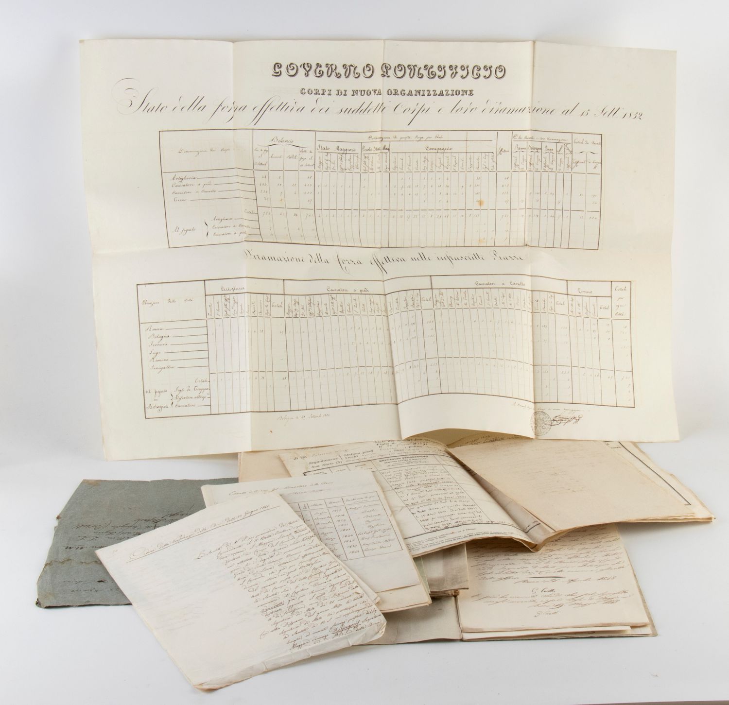 La documentazione riguarda argomenti militari ed è relativa allo stato dei servizi militari dello Stato Pontificio nell’anno 1832. Composta da fogli a stampa compilati manoscritti o interamente manoscritta, prospetti e tavole: dei Corpi militari di nuova organizzazione dello Stato Pontificio; indicazioni sulle guarnigioni di Osimo alla data del 1° maggio 1832; un inventario del materiale d’artiglieria datato Forlì 1832; nonché inventari di artiglieria con descrizioni di oggetti quali proiettili, polveri da guerra, ecc. È infine presente un quadro riassuntivo delle truppe pontificie nelle Marche di Urbino e Pesaro nell’ottobre 1832, anch’esso interamente manoscritto.Inoltre, sono presenti tre grandi tabelle prospettiche a stampa in lingua francese, con indicazioni per la costruzione di scuderie militari, oltre a una serie di lettere manoscritte con estratti di ordini del Ministero delle Armi, comprendenti la nomina di Bruti Liberati.